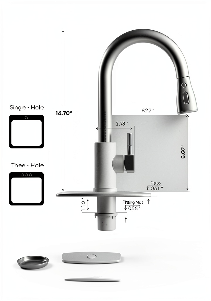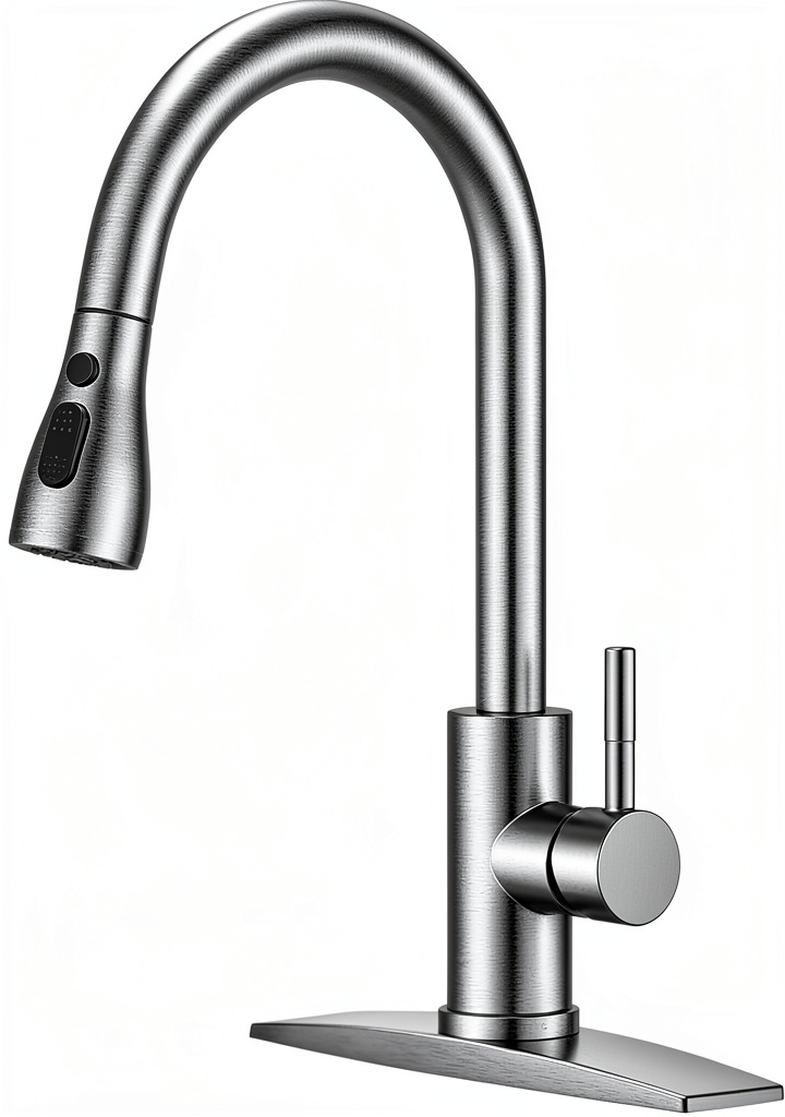 The FORIOUS kitchen faucet is a high-performance, deck-mount sink fixture crafted from premium SUS 304 stainless steel, ensuring longevity and resistance to corrosion. It features a single-handle lever design with left or right placement flexibility, a 6.69-inch gooseneck spout, and a pull-out sprayer with 360° swivel capability. Certified to cUPC, NSF/ANSI/CAN 61, and lead-free standards, this faucet delivers a flow rate of 1.8 gallons per minute and includes drip-free ceramic cartridges and high-temperature PEX hoses for enhanced durability. With an overall height of 14.76 inches and compatibility with single, double, or three-hole sinks (using the included 10-inch detachable deck plate), it suits various kitchen setups. The model FF0023C comes in multiple finishes, including Stainless Steel, and includes all necessary mounting hardware for straightforward setup.