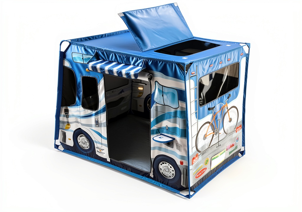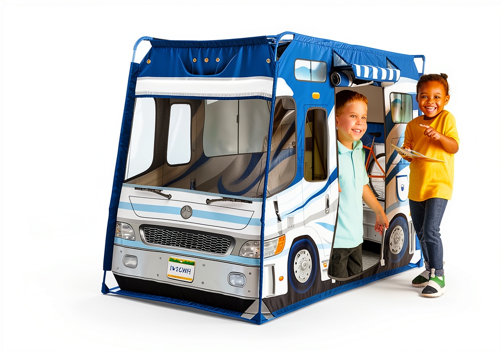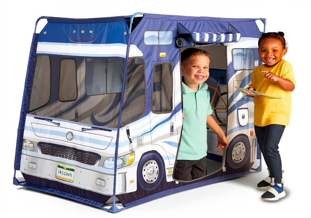 - Camper-shaped design with door, roof flaps, and screen windows for realistic play