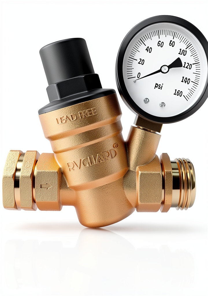 The RVGUARD water pressure regulator is engineered to protect your RV, camper, or trailer plumbing systems from the damaging effects of high water pressure. Constructed from Class C46500 lead-free brass using hot casting technology, this regulator ensures safety by containing less than 0.13% lead, well below NSF/ANSI 372 standards. It features a 3/4-inch garden hose threaded inlet and barb outlet connection, with an adjustable pressure range factory-set at 45 PSI. The built-in gauge provides real-time pressure monitoring, while the inlet screen filters impurities from water. With a threaded connector type and brass exterior finish, this unit is durable and reliable for long-term use in various environments.