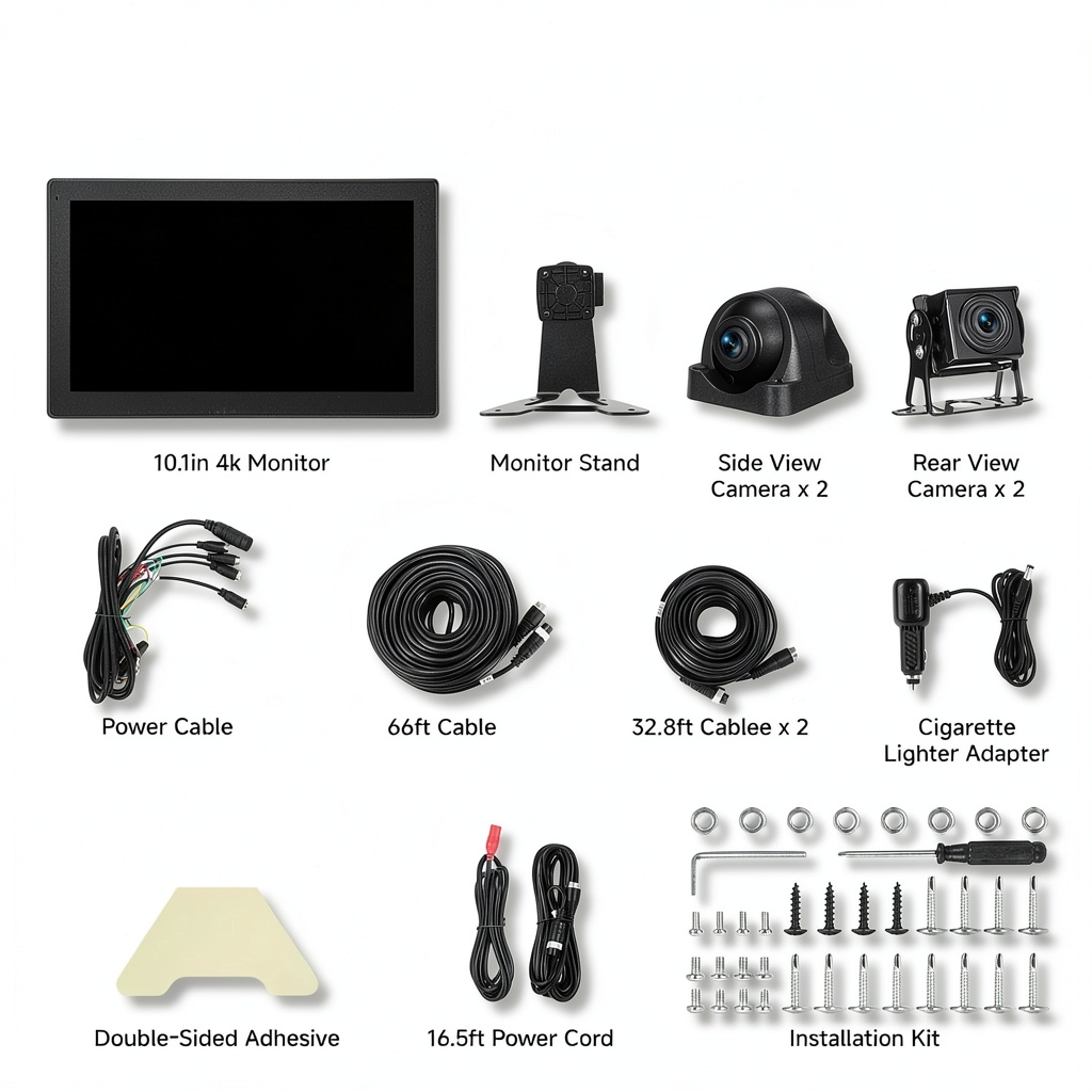The Venluna backup camera system includes a 10.1-inch 4K IPS touchscreen monitor and four 1080p cameras with CMOS infrared sensors, providing a 170-degree wide-angle view. Built with IP69 waterproof materials, it withstands extreme temperatures from -32°F to 158°F and features DVR recording with loop functionality. The system comes with cables up to 66 feet, a cigarette lighter adapter, and a monitor stand, supporting Bluetooth 5.0 for music and calls, plus a USB 2.0 port for media playback. Dimensions are 4″L x 4″W x 3″H, and it includes a 3-year warranty with lifetime support.
